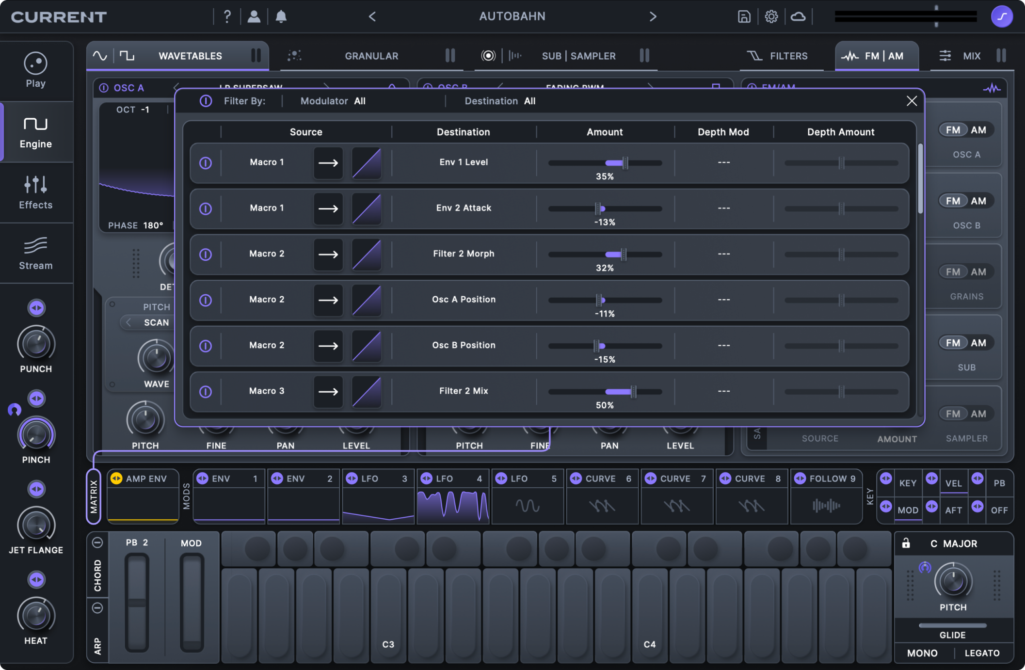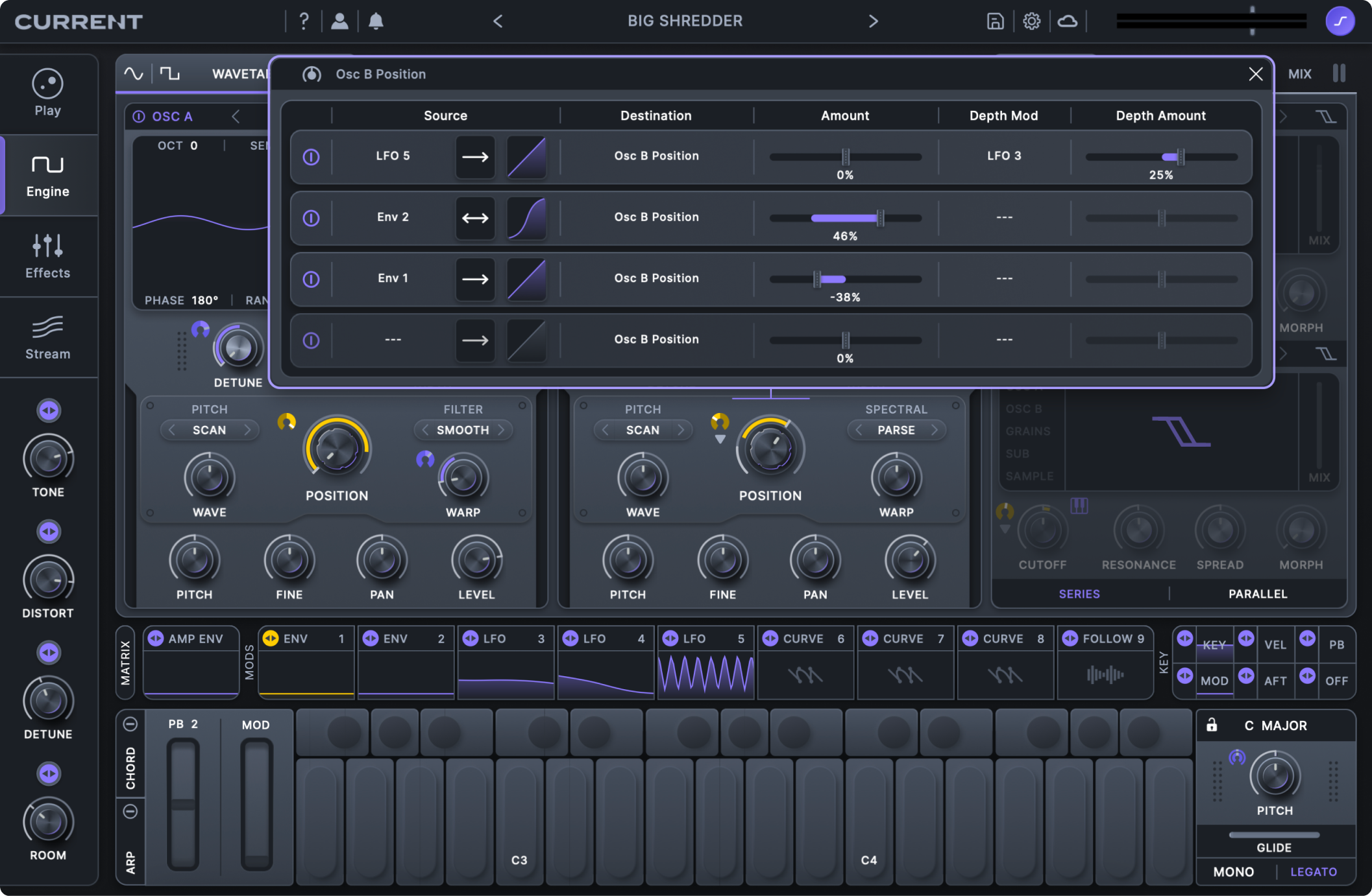 Current's modulation matrix offers a dedicated popup for editing all aspects of modulation across an entire preset.